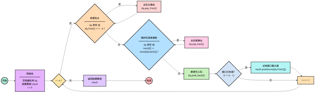 算法的流程是,我们从左到右遍历数组,并借助一个双端队列来维护一个索引序列,该序列对应的元素值从队头到队尾呈严格单调递减。对于每一个新到来的元素 $nums[i]$,我们首先从队尾开始处理:如果新元素大于或等于队尾索引所对应的元素,则说明队尾元素已不再可能成为未来任何窗口的最大值,因此将其从队尾弹出,并用新元素继续与新的队尾比较,如此循环。此过程结束后,我们将当前元素索引 $i$ 压入队尾。与此同时,我们从队头检查,如果队头元素的索引已经滑出了当前窗口的范围(即索引小于 $i – k + 1$),则将其从队头弹出。完成这些维护操作后,只要窗口已完全形成(即 $i \ge k – 1$),此时的队头索引所对应的元素,就一定是当前窗口的最大值。算法流程图如下所示。